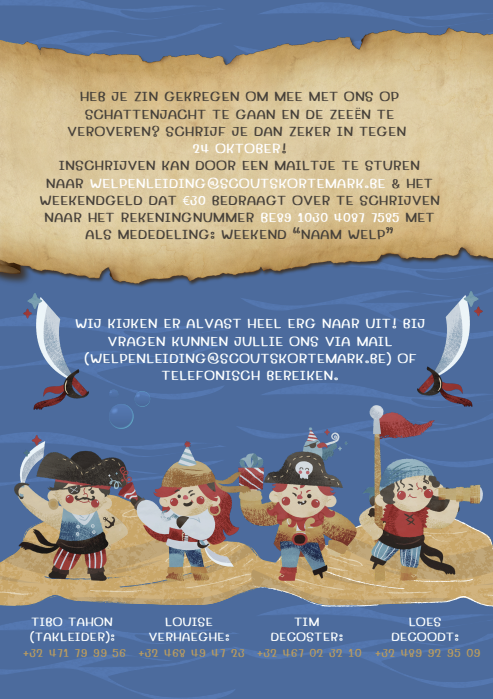 1. Inschrijven kan tot en met 24 oktober door een mailtje te sturen naar welpenleiding@scoutskortemark.be.