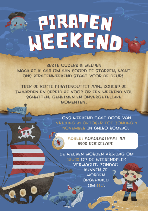 In de bijlage vinden jullie de brief van ons eerste welpenweekend. Je kan er alles over terugvinden over het thema, het startmoment, het uur van ophalen en wat de welpen allemaal moeten meebrengen.