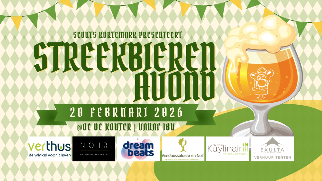 Op 20 februari 2026 organiseert Scouts Kortemark een Streekbierenavond in OC De Kouter. Vanaf 18u is iedereen welkom op onze gezellige avond vol heerlijke streekbieren, leuke randactiviteiten en een sfeervolle ambiance: